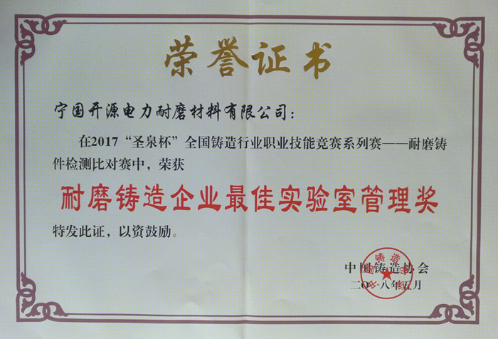 初夏五月,花開似錦,綠樹成蔭。勞動(dòng)的季節(jié)里,一派生機(jī)盎然,更有喜訊捷報(bào)傳來。在“圣泉杯”全國(guó)鑄造行業(yè)職業(yè)技能競(jìng)賽系列賽---耐磨鑄件檢測(cè)比對(duì)賽中,開源耐磨榮獲中鑄協(xié)頒發(fā)的“耐磨鑄造企業(yè)最佳實(shí)驗(yàn)室管理獎(jiǎng)”。 在同行業(yè)諸多好手中脫穎而出獲得這一獎(jiǎng)項(xiàng),一方面體現(xiàn)了我司超越領(lǐng)先的技術(shù)檢測(cè)能力,另一方面獲得這一榮譽(yù),也是我司長(zhǎng)期持久、精益求精的實(shí)驗(yàn)室管理工作的成果,更是對(duì)我司實(shí)驗(yàn)室管理工作的極大褒獎(jiǎng)。